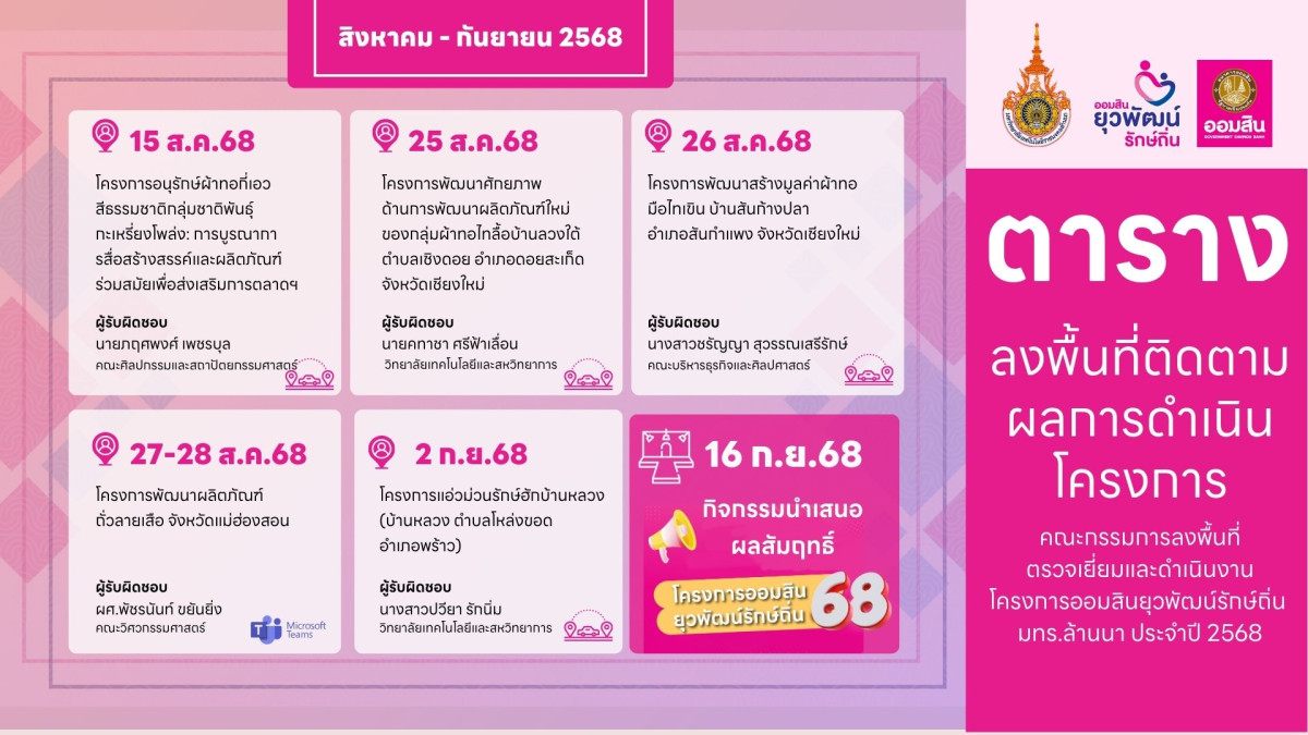 ตารางลงพื้นที่ติดตามผลการดำเนินโครงการ คณะกรรมการลงพื้นที่ตรวจเยี่ยม และดำเนินกิจกรรม โครงการออมสินยุวพัฒน์รักษ์ถิ่น มทร.ล้านนา ปี 2568 (เชียงใหม่) ดังนี้