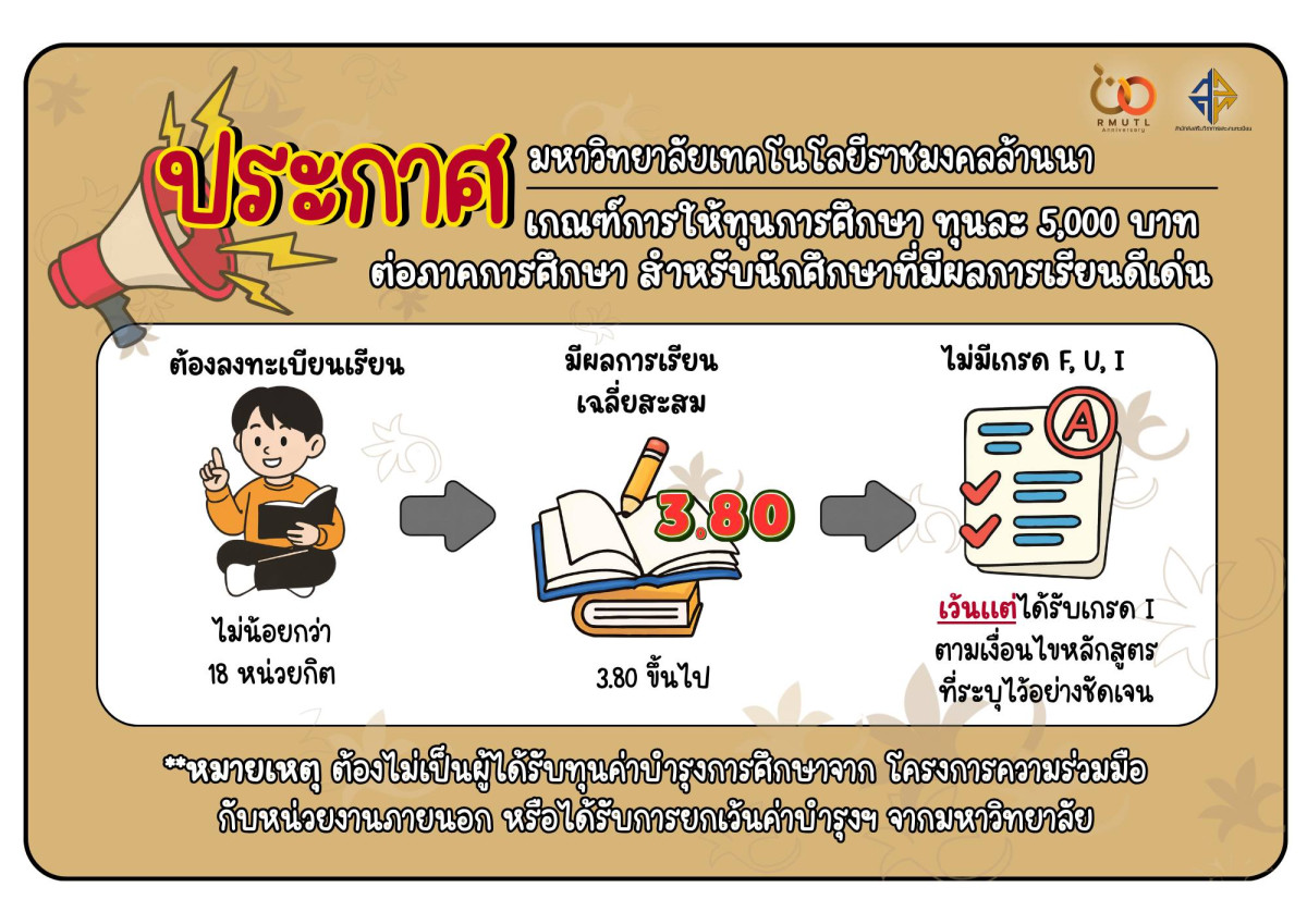 นักศึกษาที่มีคุณสมบัติตรงตามข้อกำหนด จะได้รับทุนการศึกษาคนละ 5,000 บาท ในภาคการศึกษานั้น