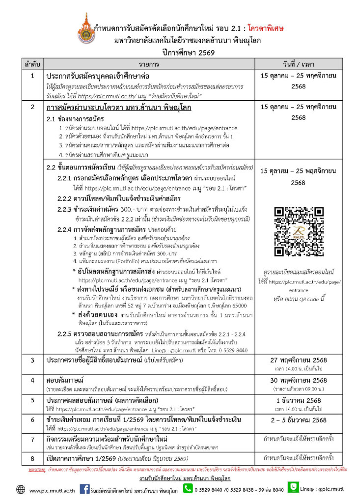 รอบ 2.1 : โควตาพิเศษ มหาวิทยาลัยเทคโนโลยีราชมงคลล้านนา พิษณุโลก ประจำปีการศึกษา 2569
