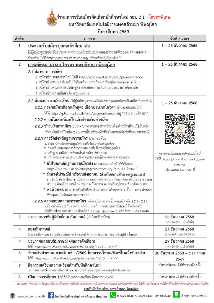 รอบ 3.1 : โควตาพิเศษ มหาวิทยาลัยเทคโนโลยีราชมงคลล้านนา พิษณุโลก ประจำปีการศึกษา 2569