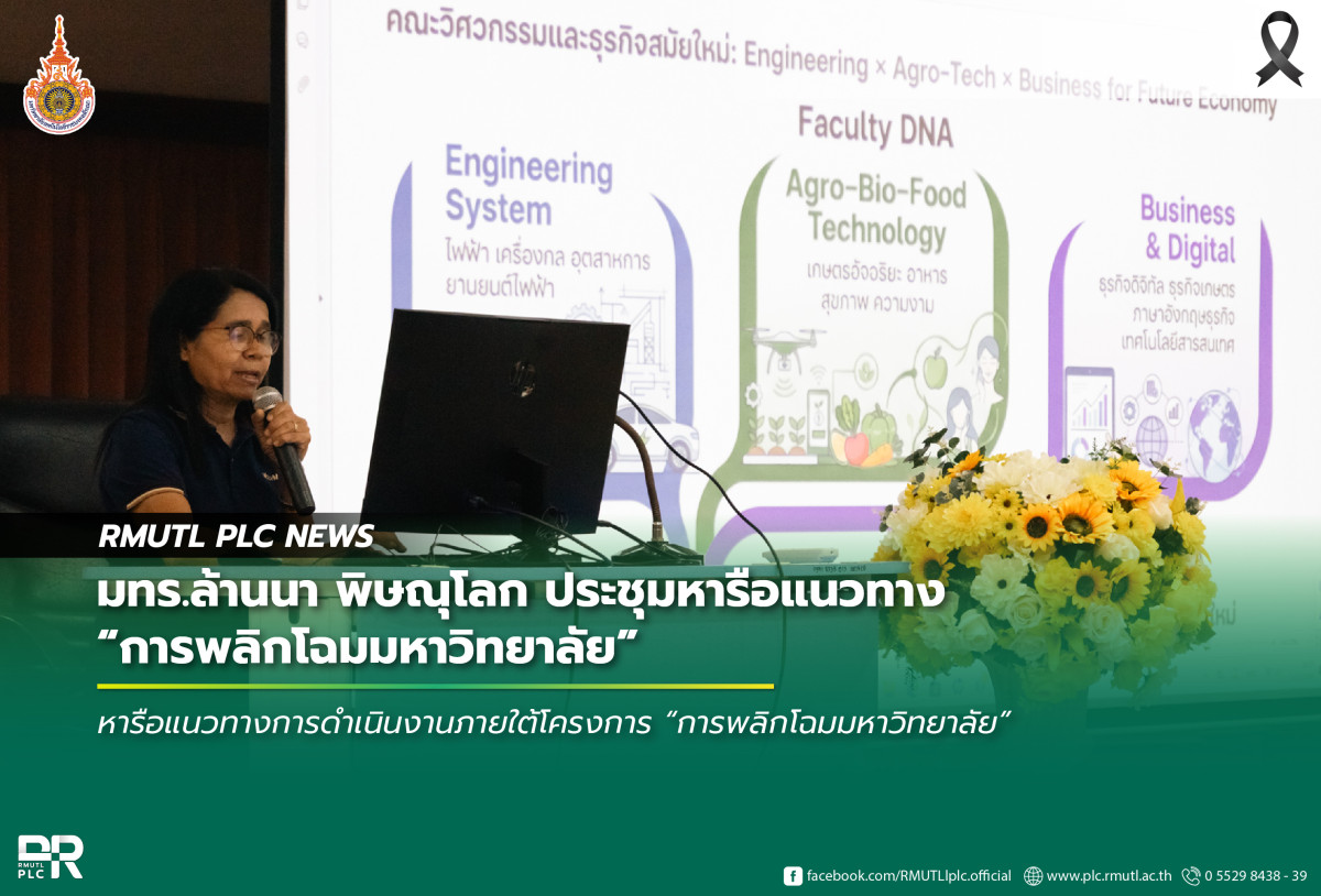 วันที่ 11 กุมภาพันธ์ 2569 เวลา 15.00 น. มหาวิทยาลัยเทคโนโลยีราชมงคลล้านนา พิษณุโลก จัดประชุมหารือแนวทางการดำเนินงานภายใต้โครงการ “การพลิกโฉมมหาวิทยาลัย” โดยมีผู้บริหารและตัวแทนกลุ่มงานต่าง ๆ เข้าร่วมอย่างพร้อมเพรียง