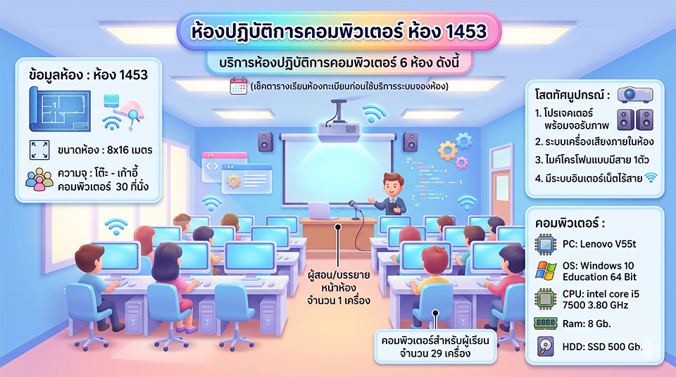 ความจุผู้ใช้งาน: รองรับสูงสุด 30 ที่นั่ง (พร้อมชุดโต๊ะ-เก้าอี้คอมพิวเตอร์)