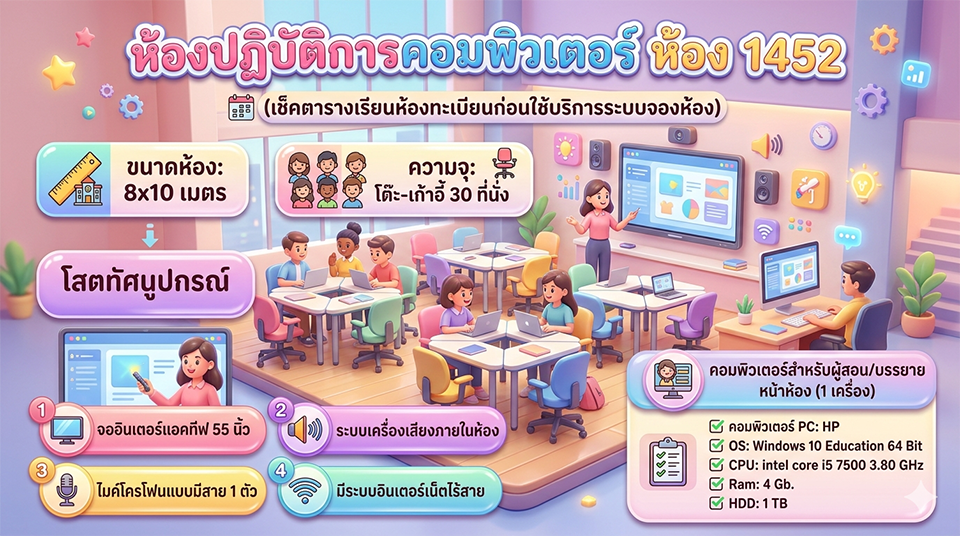 ความจุ: 30 ที่นั่ง (พร้อมชุดโต๊ะ-เก้าอี้บรรยาย)
