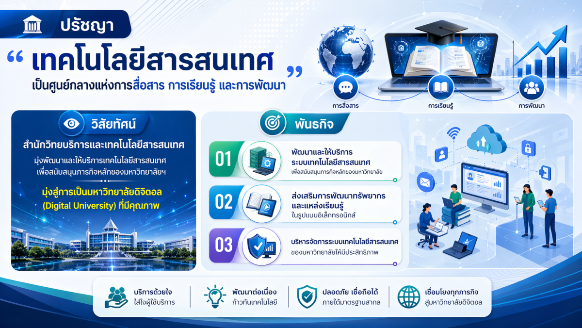 สำนักวิทยบริการและเทคโนโลยีสารสนเทศ มุ่งพัฒนาและให้บริการเทคโนโลยีสารสนเทศเพื่อสนับสนุนภารกิจหลักของมหาวิทยาลัยฯ มุ่งสู่การเป็นมหาวิทยาลัยดิจิตอล (Digital University) ที่มีคุณภาพ