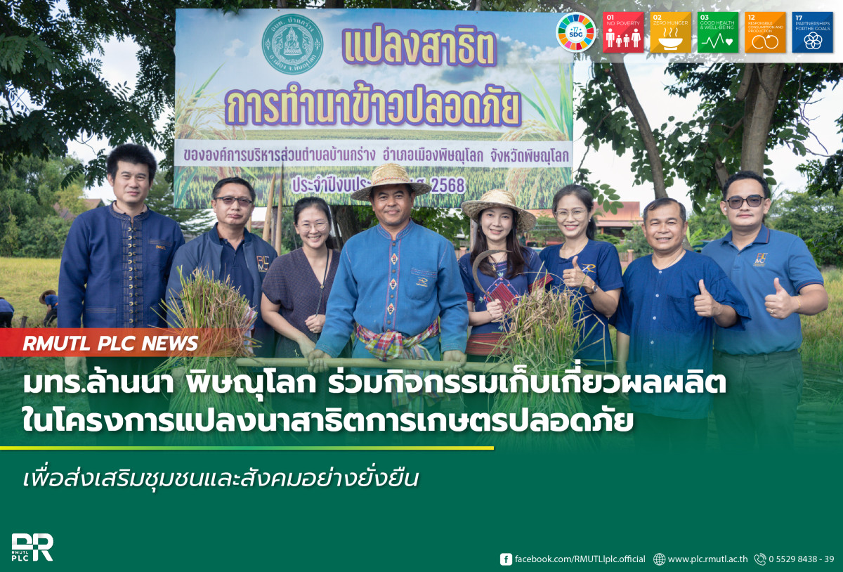วันที่ 1 ตุลาคม 2568 เวลา 09.00 น. ณ แปลงนาสาธิต องค์การบริหารส่วนตำบลบ้านกร่าง นายบุญฤทธิ์ สโมสร ผู้อำนวยการสำนักงานบริหาร มหาวิทยาลัยเทคโนโลยีราชมงคลล้านนา พิษณุโลก พร้อมด้วยคณาจารย์และบุคลากร เข้าร่วมกิจกรรมเก็บเกี่ยวผลผลิตใน “โครงการแปลงนาสาธิตการทำการเกษตรปลอดภัย” ประจำปีงบประมาณ พ.ศ. 2568