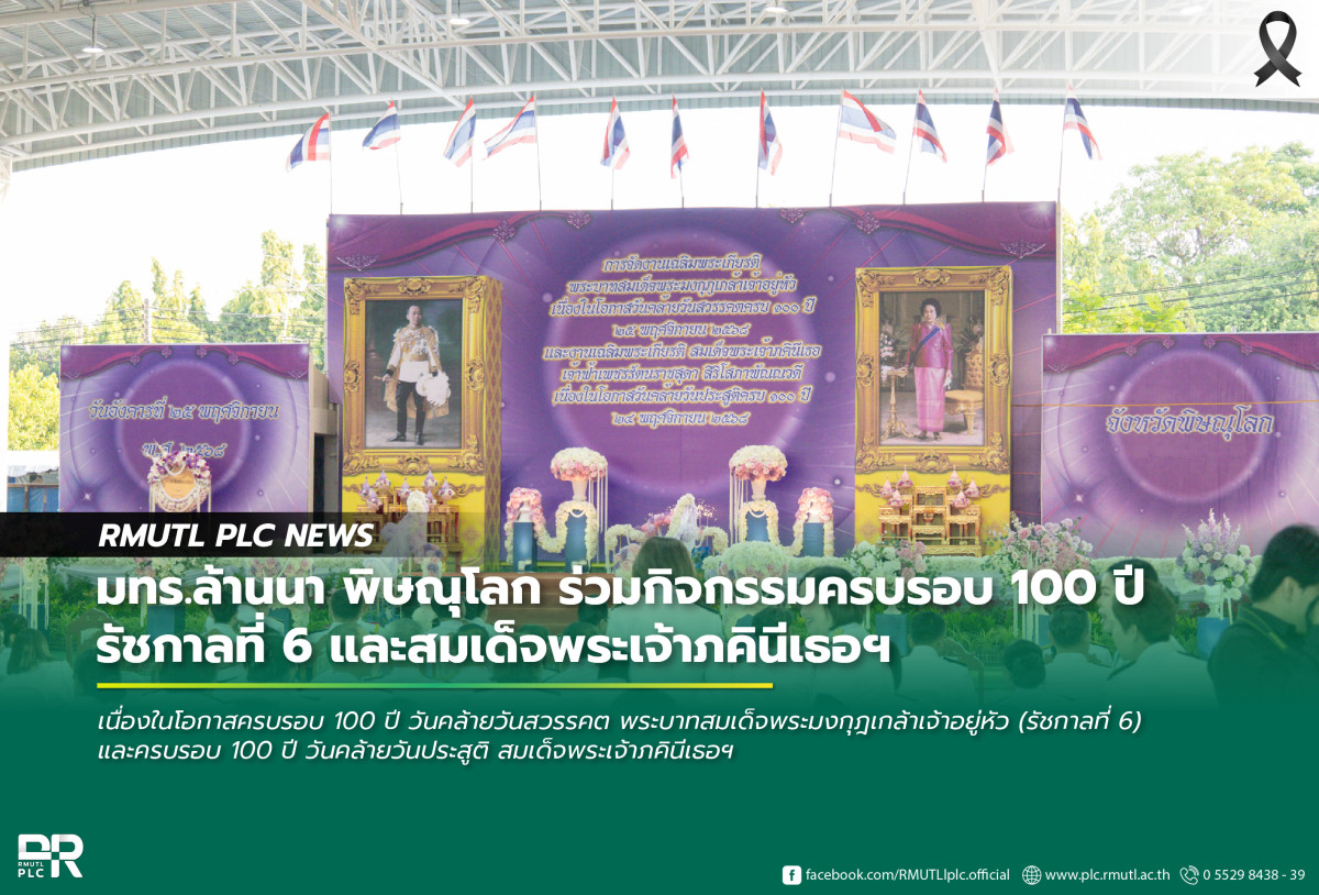 วันนี้ (25 พฤศจิกายน 2568) เวลา 07.30 น. มหาวิทยาลัยเทคโนโลยีราชมงคลล้านนา พิษณุโลก นำโดยนายบุญฤทธิ์ สโมสร ผู้อำนวยการสำนักงานบริหาร พร้อมด้วยบุคลากร เข้าร่วมกิจกรรมเนื่องในโอกาสครบรอบ 100 ปี วันคล้ายวันสวรรคต พระบาทสมเด็จพระมงกุฎเกล้าเจ้าอยู่หัว (รัชกาลที่ 6) และครบรอบ 100 ปี วันคล้ายวันประสูติ สมเด็จพระเจ้าภคินีเธอฯ ณ โดมเวทีกลาง ศาลากลางจังหวัดพิษณุโลก โดยมีนายเกียรติศักดิ์ ตรงศิริ ผู้ว่าราชการจังหวัดพิษณุโลก เป็นประธานในพิธี