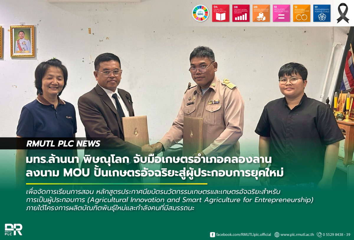 เมื่อวันที่ 8 ธันวาคม 2568 มหาวิทยาลัยเทคโนโลยีราชมงคลล้านนา พิษณุโลก นำโดย นายบุญฤทธิ์ สโมสร ผู้อำนวยการสำนักงานบริหาร พร้อมด้วย อาจารย์อารยา นุ่มนิ่ม อาจารย์ประจำหลักสูตรสารสนเทศทางธุรกิจและเทคโนโลยีธุรกิจดิจิทัล ร่วมลงนามบันทึกข้อตกลงความร่วมมือทางวิชาการ (MOU) กับ นายลภนพัทร โมกสุวรรณ เกษตรอำเภอคลองลาน ณ สำนักงานเกษตรอำเภอคลองลาน จังหวัดกำแพงเพชร