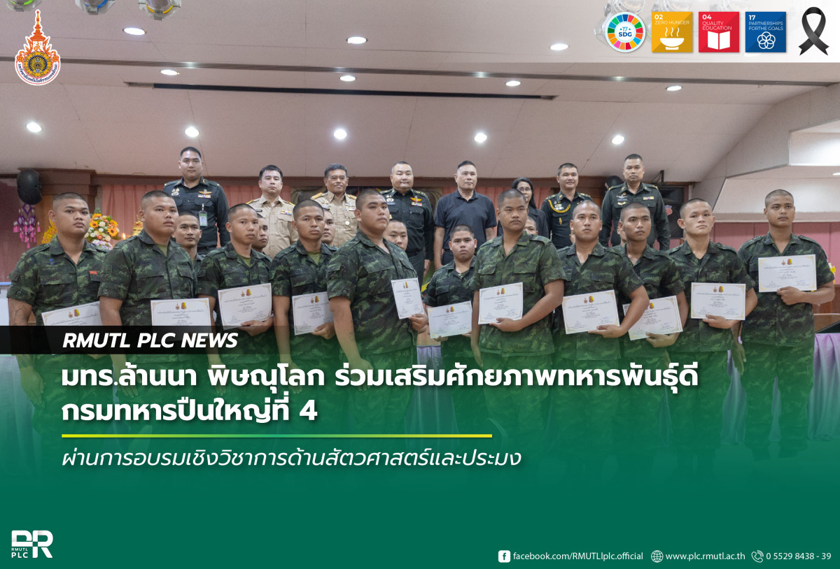 มหาวิทยาลัยเทคโนโลยีราชมงคลล้านนา พิษณุโลก จัดโครงการ “พัฒนาศักยภาพเจ้าหน้าที่โครงการทหารพันธุ์ดี” กรมทหารปืนใหญ่ที่ 4 โดยการอบรมจัดขึ้นระหว่างวันที่ 8 – 11 ธันวาคม 2568 และ 16 – 18 ธันวาคม 2568