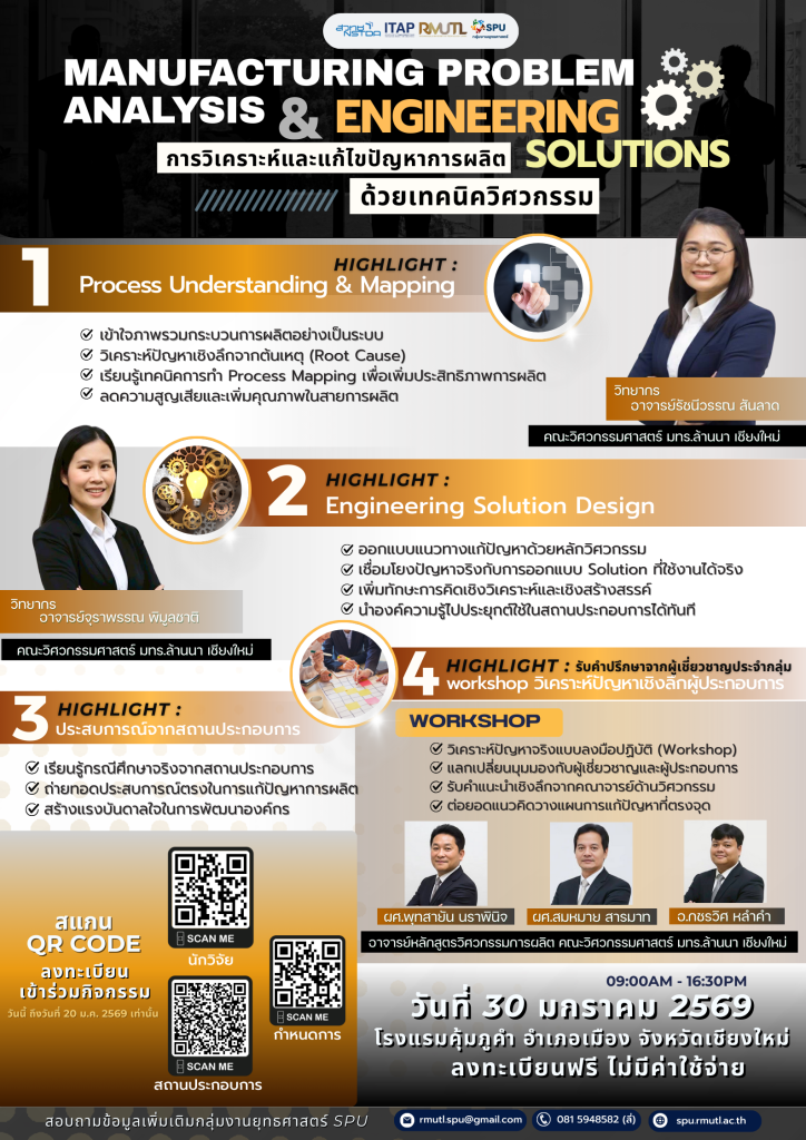 ร่วมยกระดับภาคการผลิตอย่างเป็นระบบเรียนรู้การวิเคราะห์และแก้ไขปัญหาการผลิต ให้ตรงจุด ด้วยเทคนิควิศวกรรมพร้อมแลกเปลี่ยนประสบการณ์จริงกับอาจารย์และผู้เชี่ยวชาญด้านวิศวกรรมอุตสาหการ