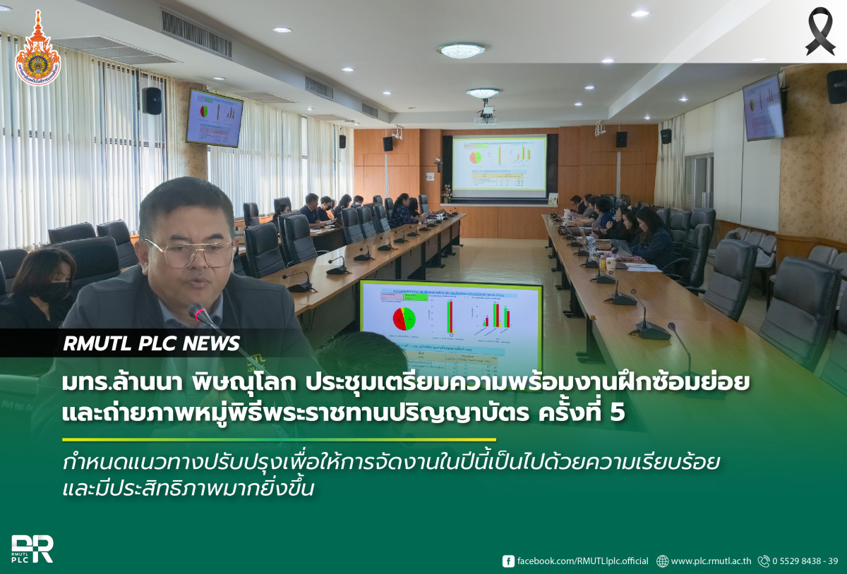 เมื่อวันที่ 15 มกราคม 2569 เวลา 09.30 น. มหาวิทยาลัยเทคโนโลยีราชมงคลล้านนา พิษณุโลก จัดการประชุมเตรียมความพร้อมการดำเนินงานฝึกซ้อมย่อยและการถ่ายภาพหมู่ สำหรับพิธีพระราชทานปริญญาบัตร ครั้งที่ 5 ประจำปีการศึกษา 2567 ณ ห้องประชุม 1423 อาคารวิทยบริการและเทคโนโลยีสารสนเทศ