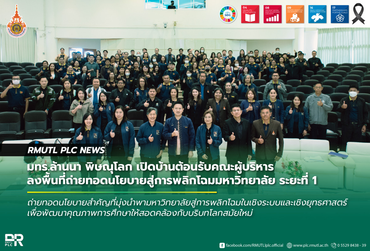 เมื่อวันที่ 19 มกราคม 2569 เวลา 08.30 น. มหาวิทยาลัยเทคโนโลยีราชมงคลล้านนา พิษณุโลก นำโดย นายบุญฤทธิ์ สโมสร ผู้อำนวยการสำนักงานบริหาร พร้อมด้วยคณะผู้บริหาร คณาจารย์ และบุคลากร ให้การต้อนรับคณะผู้บริหารมหาวิทยาลัยที่ลงพื้นที่เพื่อติดตามและดำเนิน “โครงการถ่ายทอดนโยบายเพื่อนำไปสู่การพลิกโฉมมหาวิทยาลัย ระยะที่ 1” ซึ่งจัดขึ้นระหว่างวันที่ 19–20 มกราคม 2569