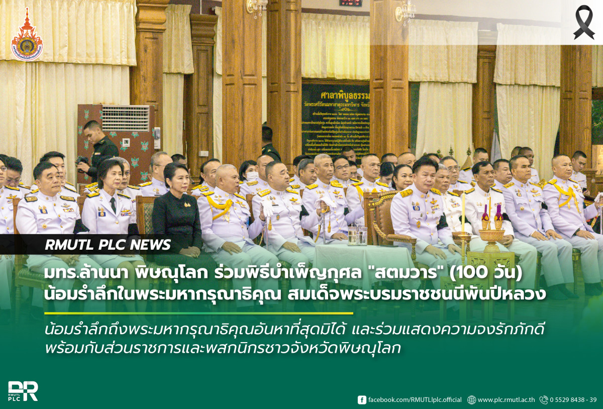 วันเสาร์ที่ 31 มกราคม 2569 เวลา 18.30 น. มหาวิทยาลัยเทคโนโลยีราชมงคลล้านนา พิษณุโลก นำโดย นายบุญฤทธิ์ สโมสร ผู้อำนวยการสำนักงานบริหาร พร้อมด้วยคณะผู้บริหาร คณาจารย์ และบุคลากร เข้าร่วมพิธีบำเพ็ญกุศลวาระครบ 100 วัน (สตมวาร) เพื่อถวายเป็นพระราชกุศลแด่ สมเด็จพระนางเจ้าสิริกิติ์ พระบรมราชินีนาถ พระบรมราชชนนีพันปีหลวง ณ ศาลาพิบูลธรรม วัดพระศรีรัตนมหาธาตุวรมหาวิหาร อำเภอเมือง จังหวัดพิษณุโลก