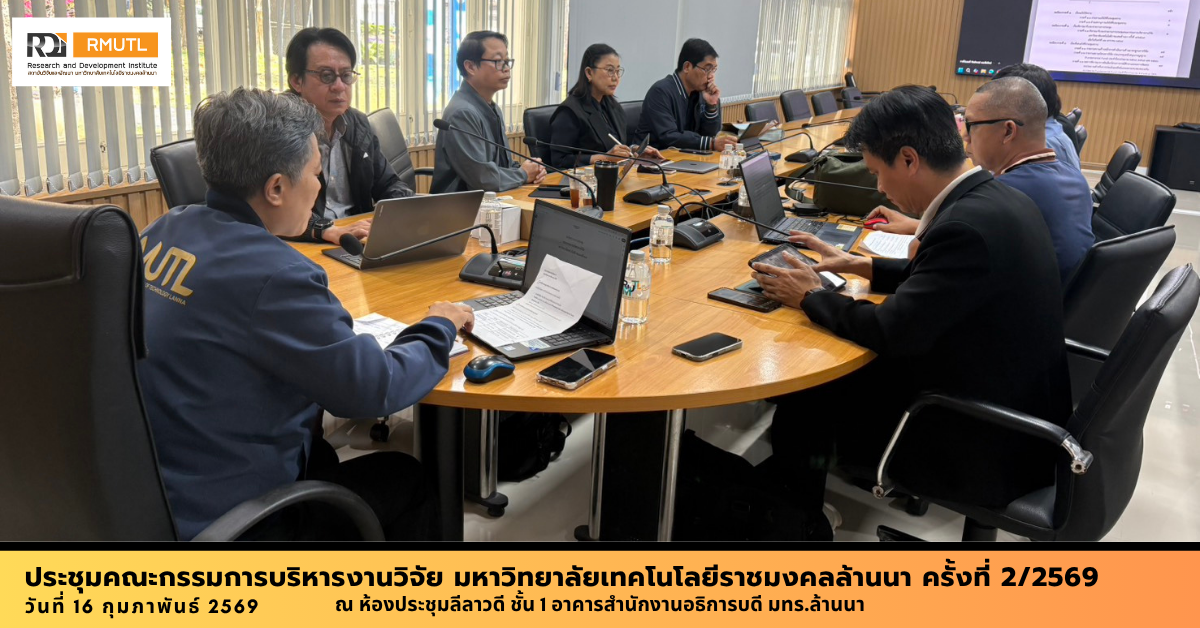 เมื่อวันที่ 16 กุมภาพันธ์ 2569 สถาบันวิจัยและพัฒนา จัดประชุมคณะกรรมการบริหารงานวิจัย มหาวิทยาลัยเทคโนโลยีราชมงคลล้านนา ครั้งที่ 2/2569 ณ ห้องประชุมลีลาวดี และผ่านระบบออนไลน์ (Microsoft Teams) โดยมี ผศ.ดร.สุภาวดี ศรีแย้ม รองอธิการบดีฝ่ายวิจัยและนวัตกรรม เป็นประธานในการประชุม