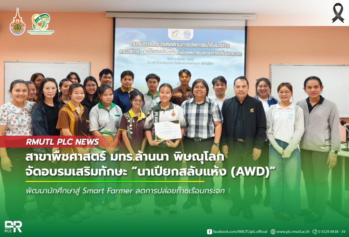 เมื่อวันที่ 4 มีนาคม 2569 สาขาพืชศาสตร์ คณะวิทยาศาสตร์และเทคโนโลยีการเกษตร มหาวิทยาลัยเทคโนโลยีราชมงคลล้านนา พิษณุโลก ได้จัดโครงการอบรมเชิงปฏิบัติการในหัวข้อ “การตรวจติดตามการจัดการน้ำในนาข้าวตามวิธีการนาเปียกสลับแห้ง (Alternate Wetting and Drying : AWD) เพื่อลดการปลดปล่อยก๊าซเรือนกระจก” โดยมีเป้าหมายเพื่อเสริมสร้างทักษะและยกระดับศักยภาพนักศึกษาให้ก้าวสู่การเป็น Smart Farmer รุ่นใหม่ ที่สามารถนำองค์ความรู้ทันสมัยไปประยุกต์ใช้ในภาคการเกษตรอย่างเป็นรูปธรรม