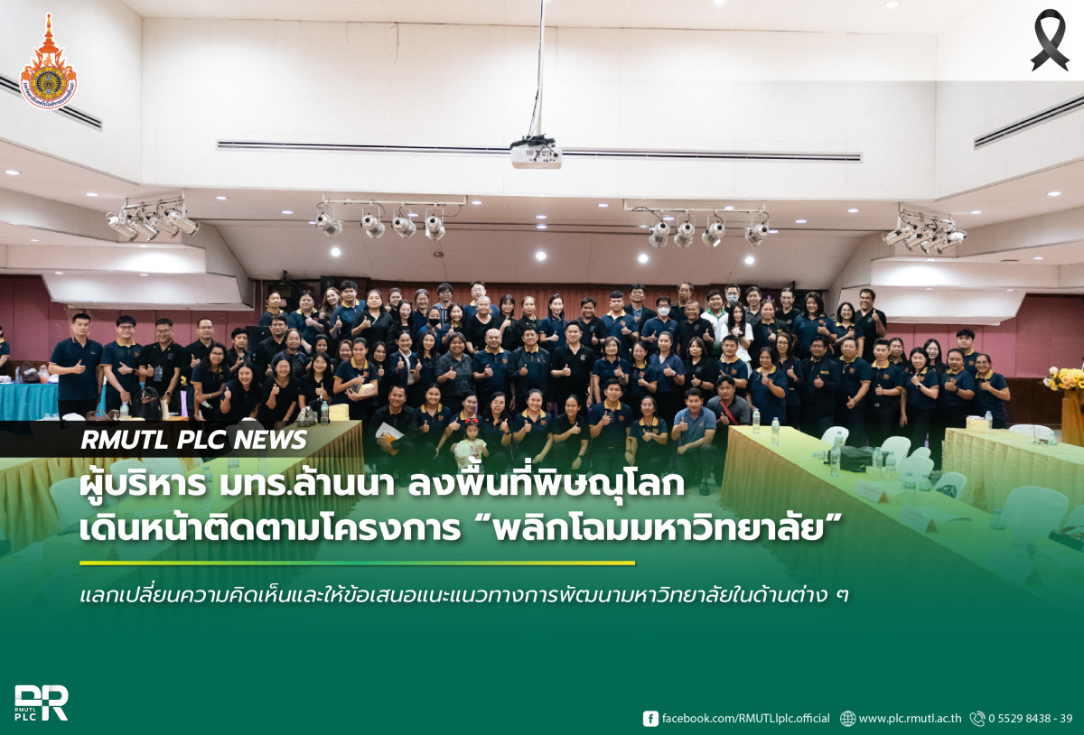 วันนี้ (9 มีนาคม 2569) เวลา 08.30 น. ผู้ช่วยศาสตราจารย์ ดร.อรรณพ ทัศนอุดม รักษาราชการแทนอธิการบดีมหาวิทยาลัยเทคโนโลยีราชมงคลล้านนา นำทีมผู้บริหารลงพื้นที่ มหาวิทยาลัยเทคโนโลยีราชมงคลล้านนา พิษณุโลก เพื่อร่วมติดตามความก้าวหน้าโครงการ “พลิกโฉมมหาวิทยาลัย” ณ หอประชุมราชมงคลบ้านกร่าง 50 ปี