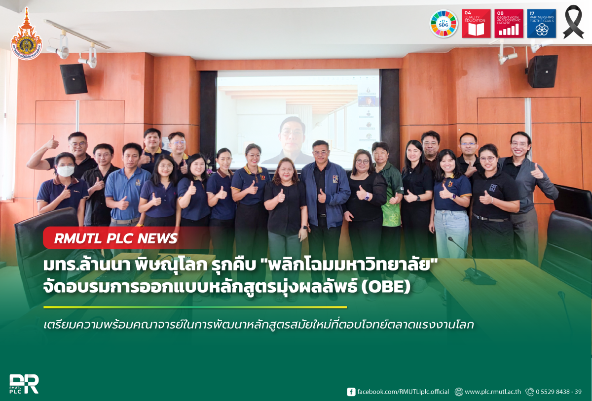 วันนี้ (27 เมษายน 2569) มหาวิทยาลัยเทคโนโลยีราชมงคลล้านนา พิษณุโลก เดินหน้ายกระดับมาตรฐานการศึกษาคุณภาพสูง จัดโครงการอบรมเชิงปฏิบัติการ “การออกแบบหลักสูตรการศึกษาที่มุ่งเน้นผลลัพธ์ (Outcome-Based Education : OBE)” เพื่อเตรียมความพร้อมคณาจารย์ในการพัฒนาหลักสูตรสมัยใหม่ที่ตอบโจทย์ตลาดแรงงานโลก