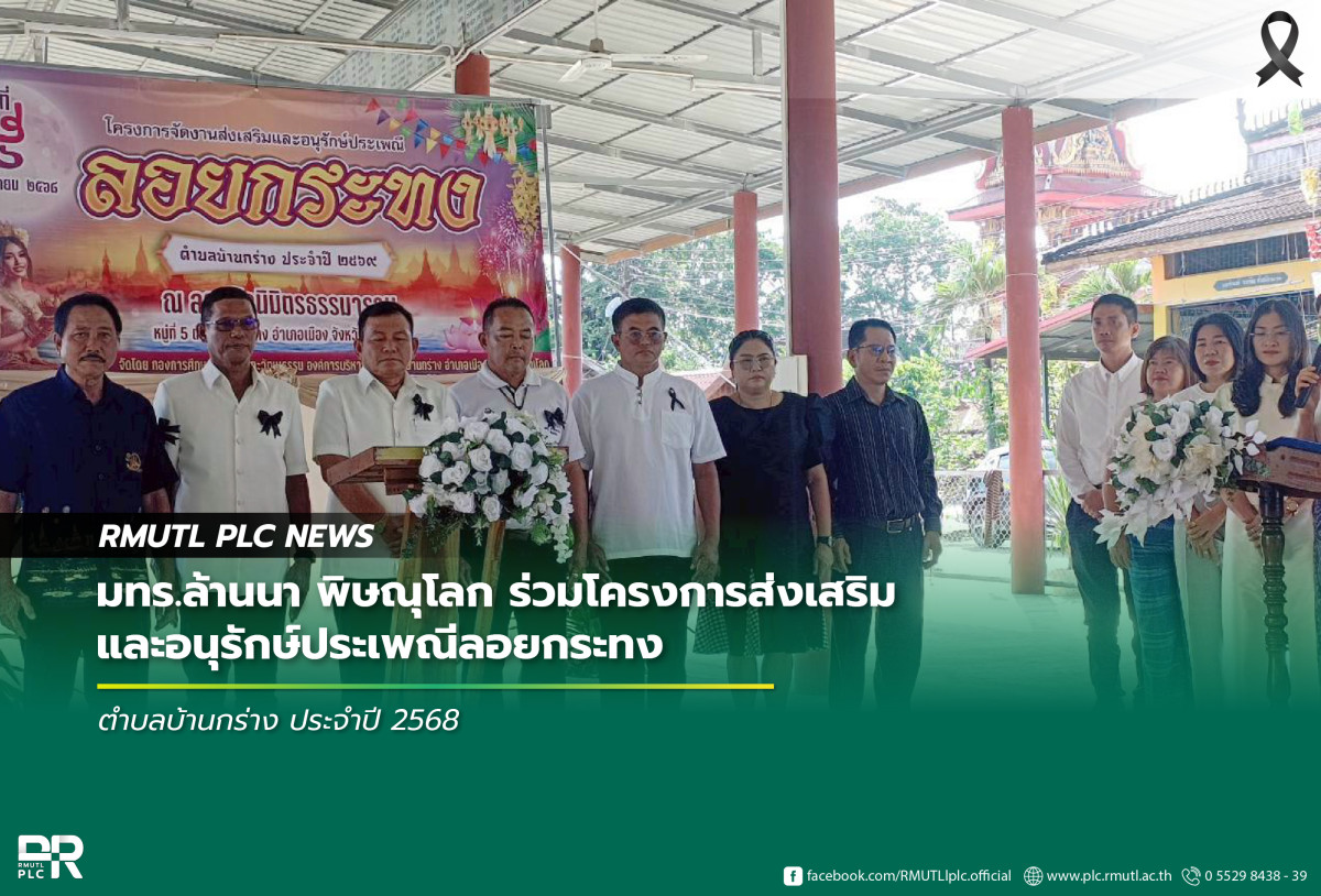 เมื่อวันที่ 5 พฤศจิกายน 2568 เวลา 08.30 น. นายบุญฤทธิ์ สโมสร ผู้อำนวยการสำนักงานบริหาร มหาวิทยาลัยเทคโนโลยีราชมงคลล้านนา พิษณุโลก พร้อมด้วยบุคลากร ได้เข้าร่วมโครงการส่งเสริมและอนุรักษ์ประเพณีลอยกระทง ของตำบลบ้านกร่าง ประจำปี 2568 อย่างพร้อมเพรียง ณ วัดนิมิตรธรรมาราม หมู่ที่ 5 ตำบลบ้านกร่าง อำเภอเมืองพิษณุโลก จังหวัดพิษณุโลก