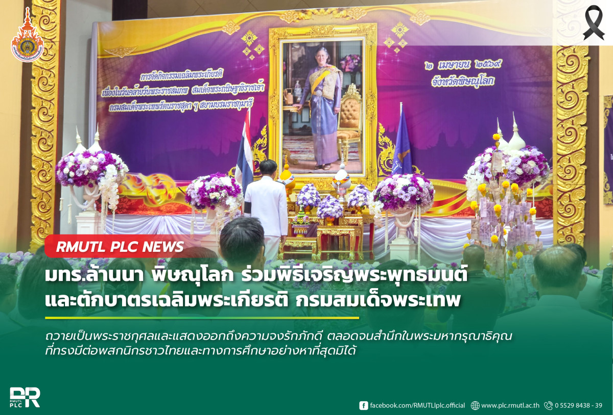 วันนี้ (2 เมษายน 2569) เวลา 07.00 น. ณ ศาลาประชาคม ศาลากลางจังหวัดพิษณุโลก นายบุญฤทธิ์ สโมสร ผู้อำนวยการสำนักงานบริหาร มหาวิทยาลัยเทคโนโลยีราชมงคลล้านนา พิษณุโลก พร้อมด้วย คณาจารย์ และบุคลากร เข้าร่วมกิจกรรมเฉลิมพระเกียรติสมเด็จพระกนิษฐาธิราชเจ้า กรมสมเด็จพระเทพรัตนราชสุดาฯ สยามบรมราชกุมารี เนื่องในโอกาสวันคล้ายวันพระราชสมภพ 2 เมษายน 2569
